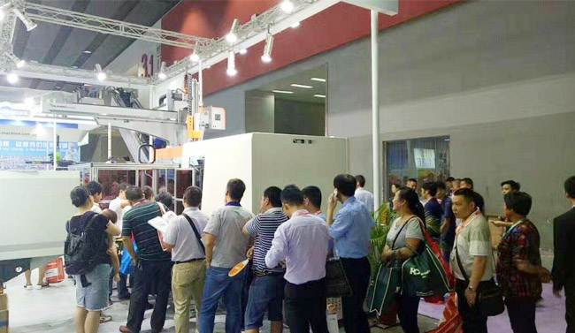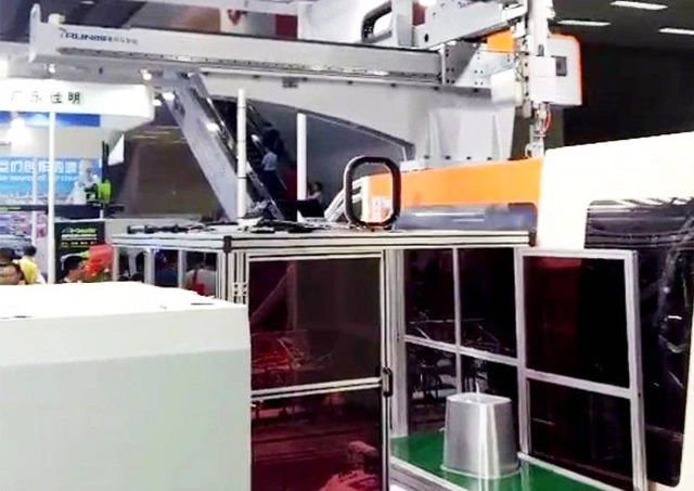 With the 31st International Exhibition on Plastics and Rubber Industries (CHINAPLAS) coming, the leader of RUNMA had an inspiration – "why not produce our products on scene and demonstrate the entire process of production to participants?" And he thought we could even give those finished products to regular and potential customers at the exhibition. Actions speak louder than words. Once that's settled, we had contacted 2 industry counterparts, namely Renxing Machine and Huayang Furniture, and talked to them about the idea. Surprisingly, they appreciated it and did not hesitate to join us. At the exhibition, with Huayang providing materials and Renxing showing their machines, Runma employed its robotic arms to produce a waste can. Specifically, we determined and set beforehand the mold of our waste can, then we utilized the automated system to put materials into the machine provided by Renxing, followed by a series of automated processing, finally we got our waste can.